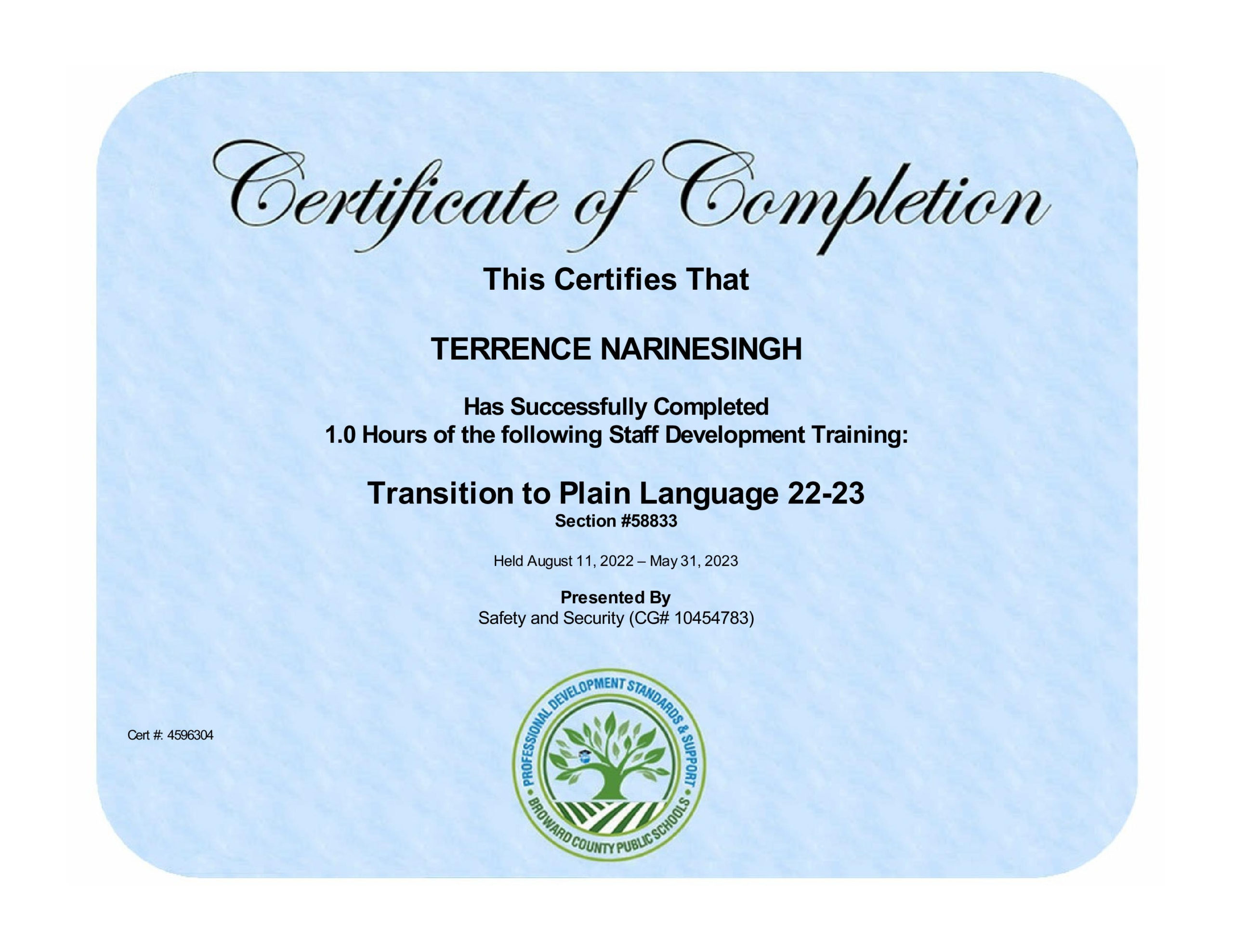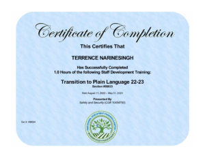 Certificate of Completion of Transition to Plain Language – Dr Terrence Narinesingh