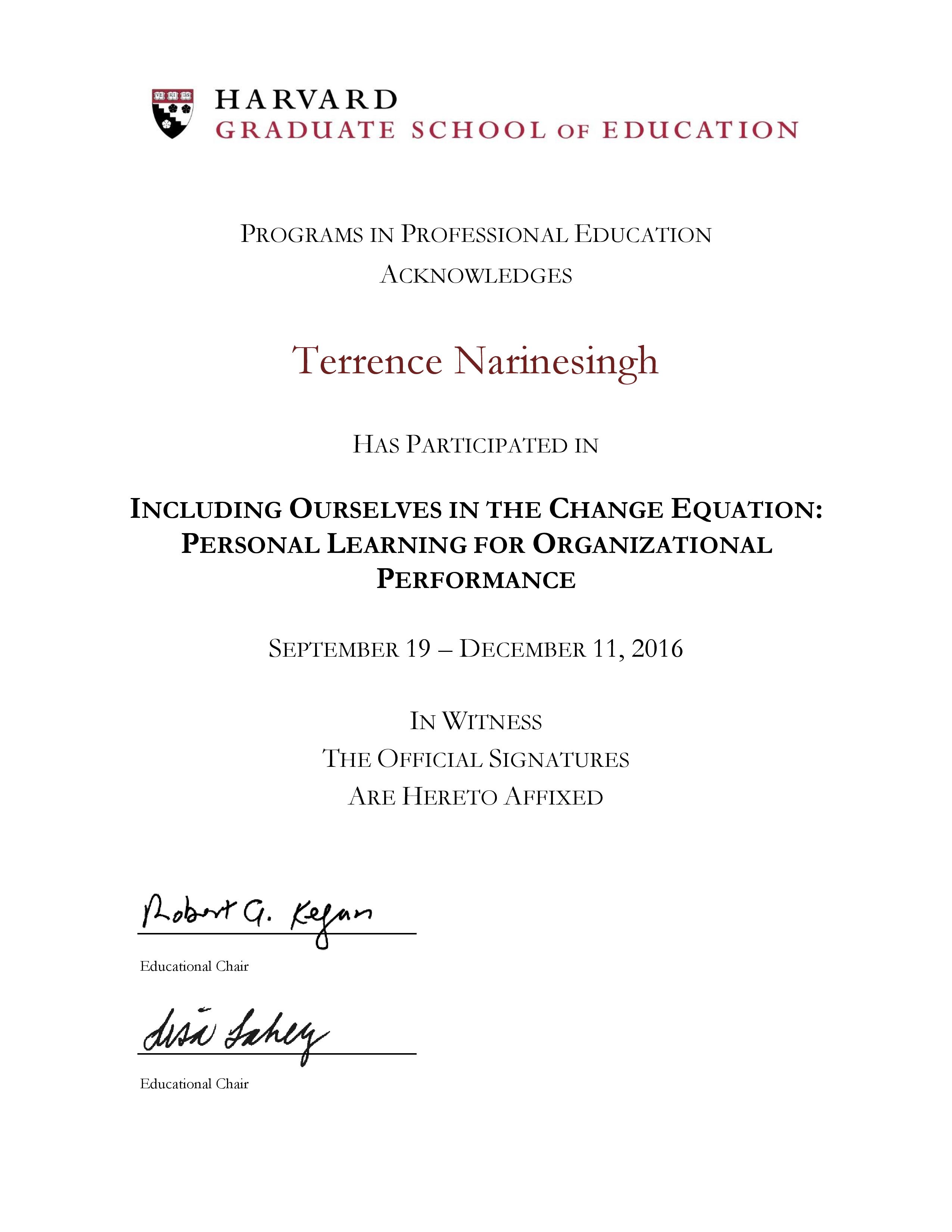 Terrence Narinesingh – Harvard University Certificate in Organizational Performance