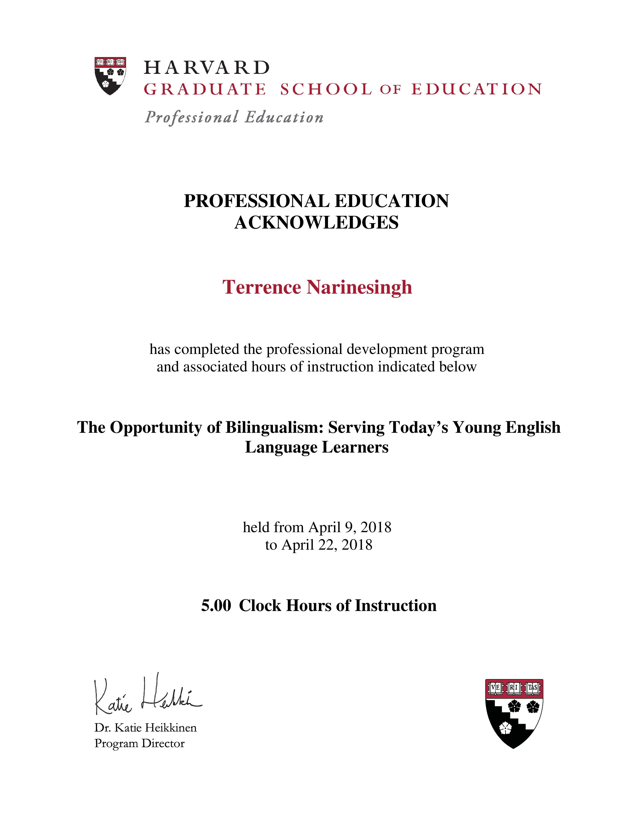 Terrence Narinesingh_Harvard University Certificate 2018_The Opportunity of Bilingualism