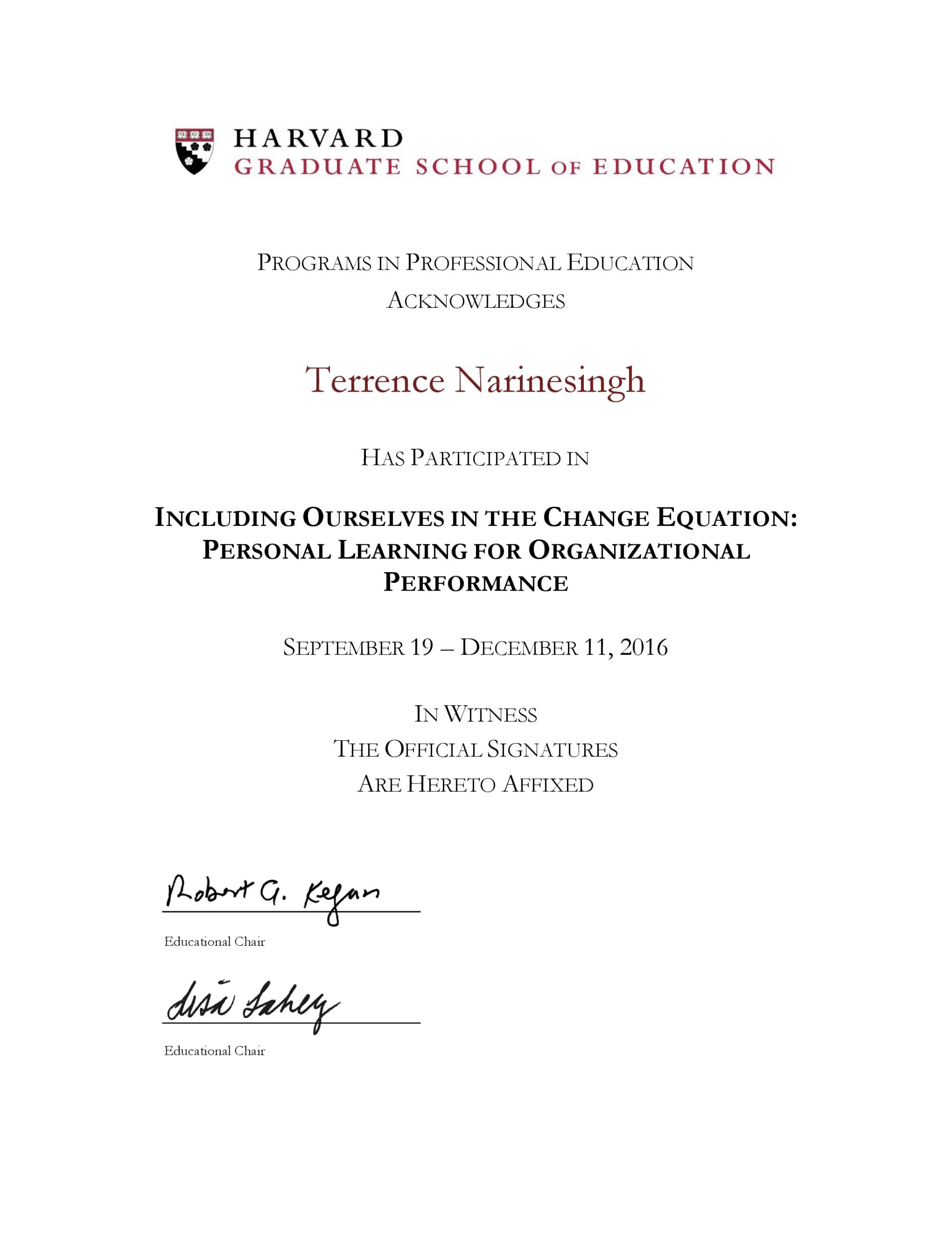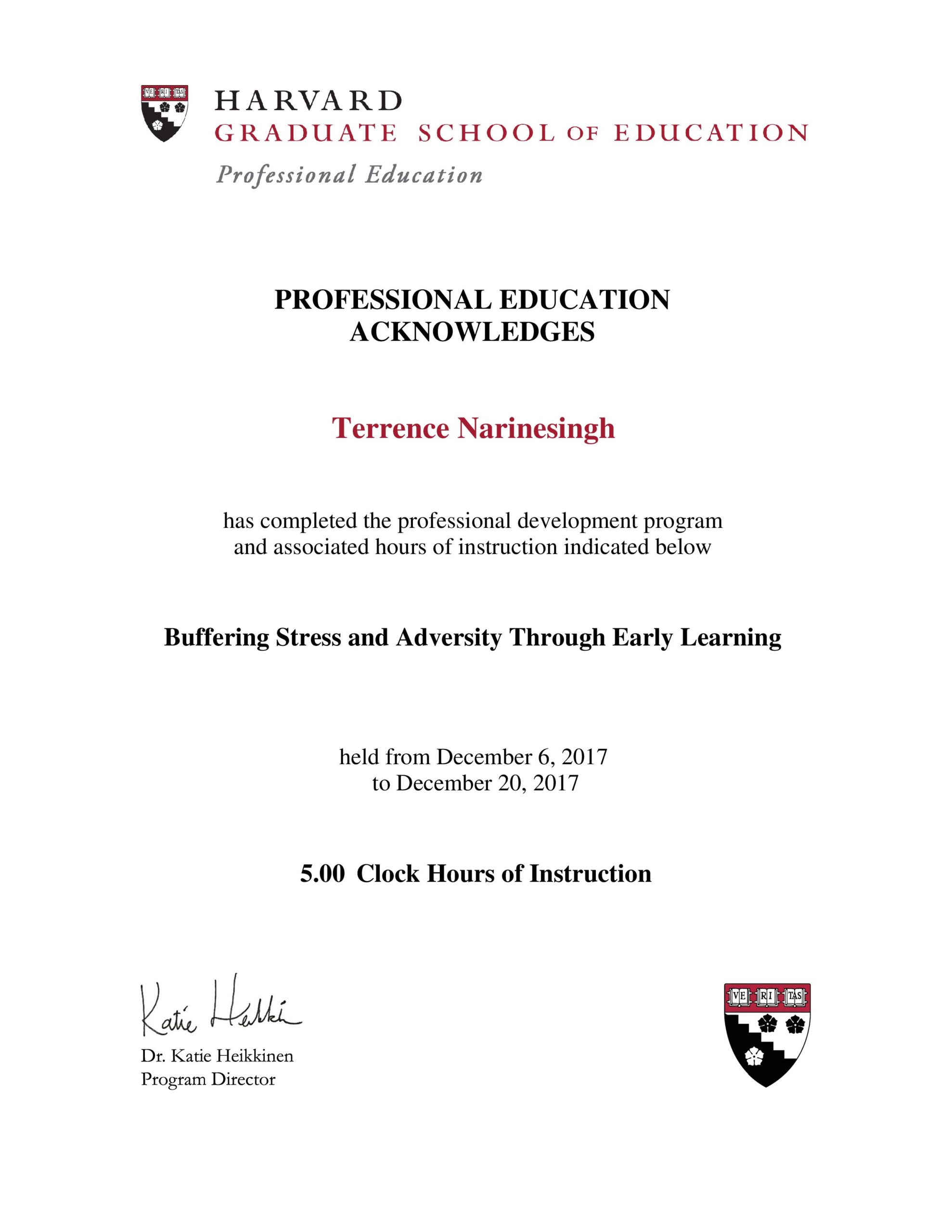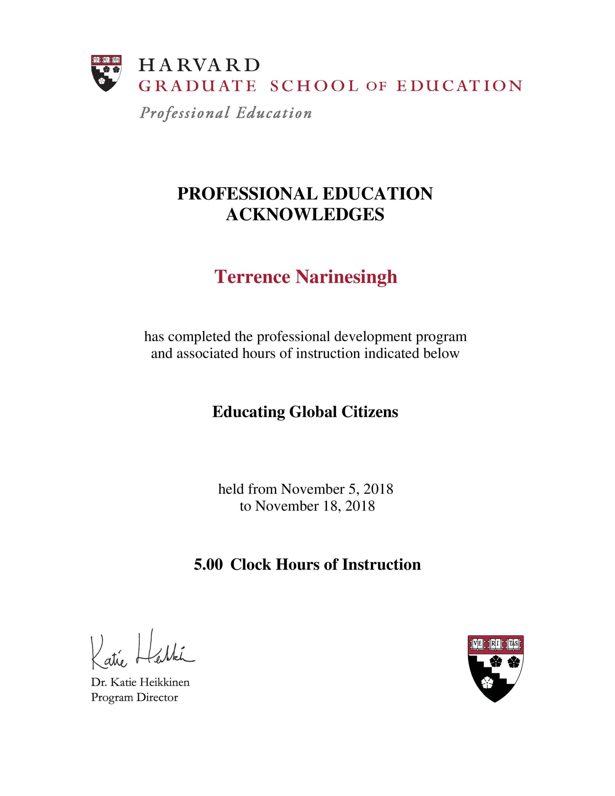 Harvard University Harvard University Educating Global Citizens Certificate – Terrence Narinesingh Elevator Pitch – Educating Global Citizens – Terrence Narinesingh – Harvard University 1 Certificate – Harvard Education Redesign – Terrence Narinesingh – 2018 Welcome to Online Learning Recent Education Reform-3 Gaps Remain-4 Recent Education Reform Problems with the Old Engine Why We Failed Why We Failed-2 Recent Education Reform-4 The Mission The Mission-2 Leading Change Leading Change-2 Pulling It Together Terrence Narinesingh Harvard University Profile Terrence Narinesingh Harvard Certificate for Early Learning Harvard University_Terrence Narinesingh_Persistent-Fear-and-Anxiety-Can-Affect-Young-Childrens-Learning-and-Development Harvard University_Terrence Narinesingh_Lesson Plan Tool Harvard University_Terrence Narinesingh_Instructional Reflection Protocol Harvard University_Terrence Narinesingh_handout5 Harvard University_Terrence Narinesingh_Enhancing-and-Practicing-Executive-Function-Skills-with-Children-from-Infancy-to-Adolescence-1 Harvard University_Terrence Narinesingh_e232.full Harvard University_Terrence Narinesingh_124_Adverse_Experiences-1 DICE The Including Ourselves in the Change Equation (IOCE)- Personal Learning for Organizational Performance Harvard Certificate Harvard University Certificate 2019 – College-Going Identity and Student Success Harvard University Certificate 2019 – Using Research to Inform Decisions 1 Harvard University Certificate_2016_Dr Terrence Narinesingh_Organizational Performance 2 Harvard University Certificate_2017_Dr Terrence Narinesingh_Early Learning 3 Harvard University Certificate_2018_Dr Terrence Narinesingh_Education Redesign 4 Harvard University Certificate_2018_Dr Terrence Narinesingh_Bilingualism 5 Harvard University Certificate_2018_Dr Terrence Narinesingh_Educating Global Citizens 6 Harvard University Certificate_2019_Dr Terrence Narinesingh_Using Research