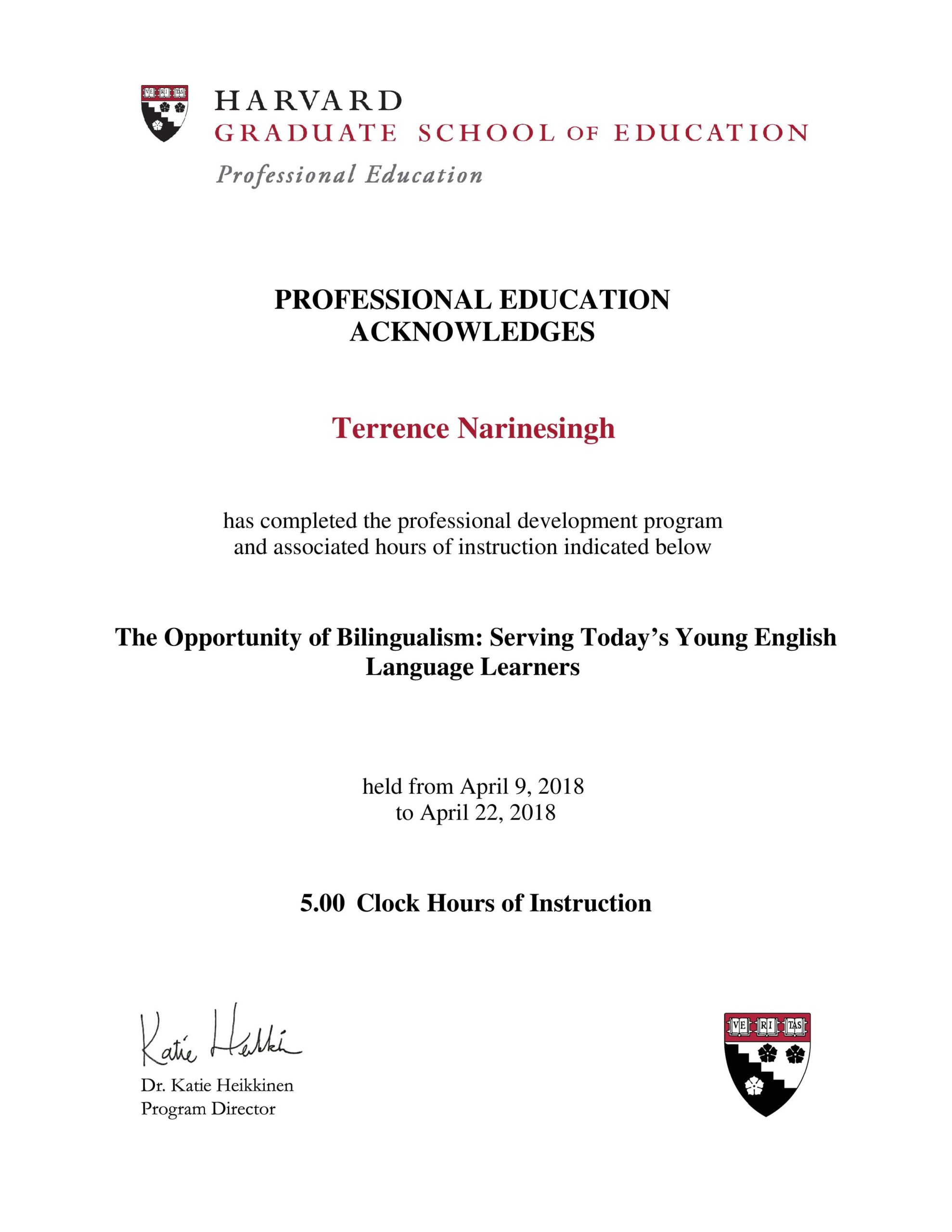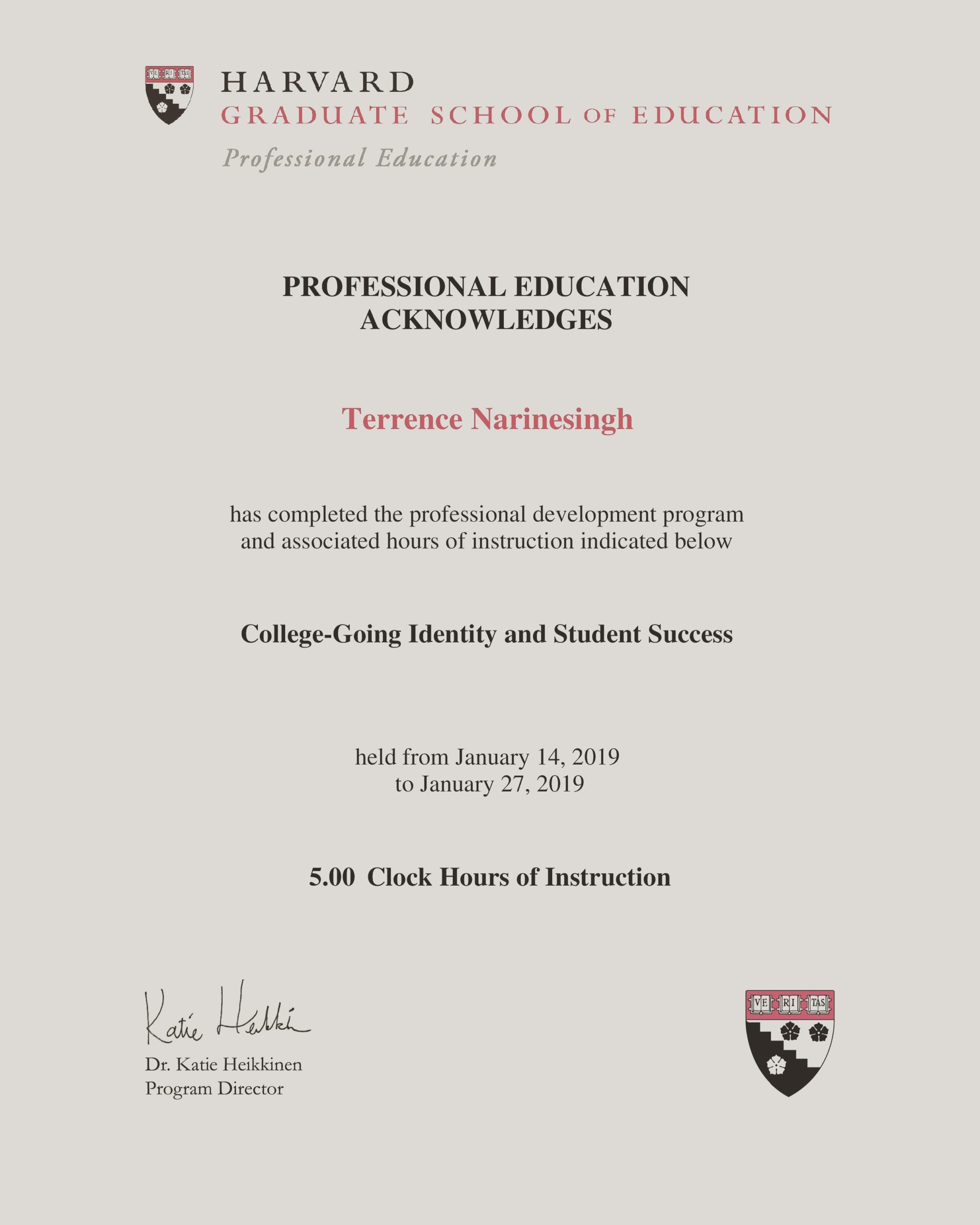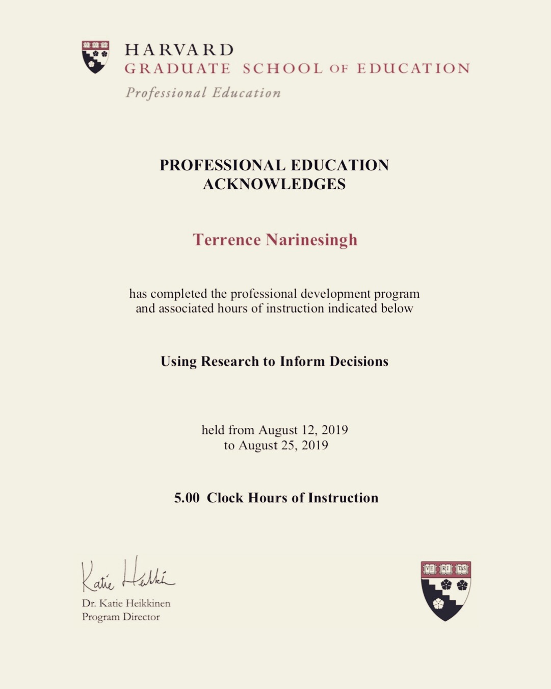 Harvard University Harvard University Educating Global Citizens Certificate – Terrence Narinesingh Elevator Pitch – Educating Global Citizens – Terrence Narinesingh – Harvard University 1 Certificate – Harvard Education Redesign – Terrence Narinesingh – 2018 Welcome to Online Learning Recent Education Reform-3 Gaps Remain-4 Recent Education Reform Problems with the Old Engine Why We Failed Why We Failed-2 Recent Education Reform-4 The Mission The Mission-2 Leading Change Leading Change-2 Pulling It Together Terrence Narinesingh Harvard University Profile Terrence Narinesingh Harvard Certificate for Early Learning Harvard University_Terrence Narinesingh_Persistent-Fear-and-Anxiety-Can-Affect-Young-Childrens-Learning-and-Development Harvard University_Terrence Narinesingh_Lesson Plan Tool Harvard University_Terrence Narinesingh_Instructional Reflection Protocol Harvard University_Terrence Narinesingh_handout5 Harvard University_Terrence Narinesingh_Enhancing-and-Practicing-Executive-Function-Skills-with-Children-from-Infancy-to-Adolescence-1 Harvard University_Terrence Narinesingh_e232.full Harvard University_Terrence Narinesingh_124_Adverse_Experiences-1 DICE The Including Ourselves in the Change Equation (IOCE)- Personal Learning for Organizational Performance Harvard Certificate Harvard University Certificate 2019 – College-Going Identity and Student Success Harvard University Certificate 2019 – Using Research to Inform Decisions 1 Harvard University Certificate_2016_Dr Terrence Narinesingh_Organizational Performance 2 Harvard University Certificate_2017_Dr Terrence Narinesingh_Early Learning 3 Harvard University Certificate_2018_Dr Terrence Narinesingh_Education Redesign 4 Harvard University Certificate_2018_Dr Terrence Narinesingh_Bilingualism 5 Harvard University Certificate_2018_Dr Terrence Narinesingh_Educating Global Citizens 6 Harvard University Certificate_2019_Dr Terrence Narinesingh_Using Research